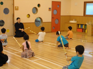 剣道教室 錬心館の剣道の先生たちによる指導 剣道は、日本の古くからある武道の一つです。お子さんたちは初めての剣道に最初は緊張しますが、だんだんと大きな声とともに素振りができるようになります。忍耐力や集中力を身につけ、同時に礼儀も学べます。始まりの礼から終わりの礼まで背筋を伸ばし、「ハイ!」と先生の指示に従って「目で聞く」を実践しています。