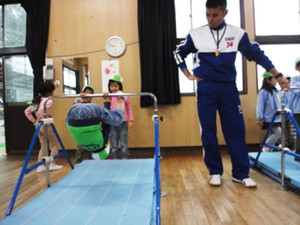 体育活動 男性の専任の先生による指導 跳び箱・鉄棒・マット・縄跳び等 体操教室では、マット・跳び箱・縄跳び・鉄棒などを通し、この時期に養うことのできる運動の基礎能力、平衡性(バランス)、敏捷性、調整力(器用さ)柔軟性を身につけながら頑張る心、成し遂げることの大切さを体験させ、心身ともに健康な成長をすることを目的としてます。