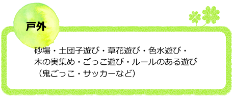 自発性を促す活動 イメージを実現する喜び・人間関係を築き社会性を促す遊び幼児期にとっての遊びは心身の調和の取れた学習です。友達と遊び、社会性・道徳心を育み、自然とのふれあいを通して 子どもらしいみずみずしい感性を育てます。